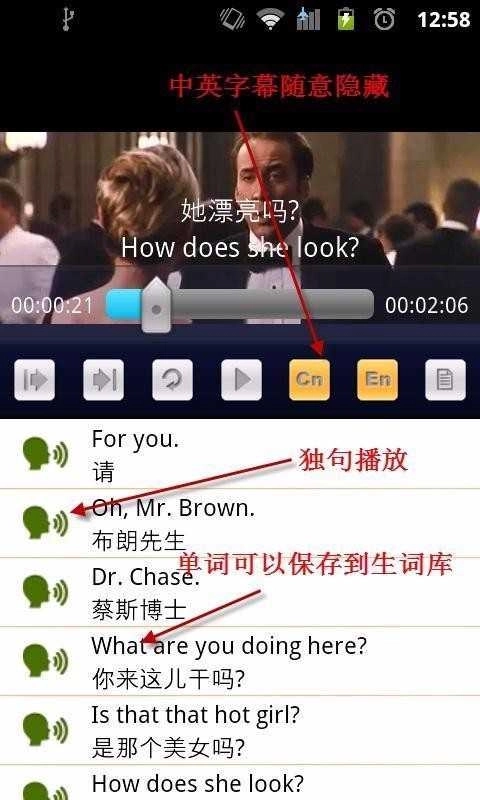 在观看电影片段时,能够自由隐藏中文字幕或英文字幕,这样可以更有效地进行句子的记忆和背诵。
